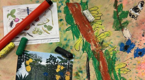 Our Year 1's started by enjoying the work of Henri Rousseau, Jan van Kessel and the late local writer and illustrator, David McKee. We responded with our own drawings (ink on watercolour) and then added colour using pastels.