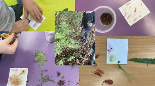 We watched a video about Andy Goldsworthy, a British Sculptor who has become know for making art from things he finds in the landscape. In the video, he shared how he takes ice and rocks from the landscape and lets it make a "drawing" as it thaws in his studio. Inspired by this, we went outside to look for colours in nature and experimented with creating colours with our found natural things.