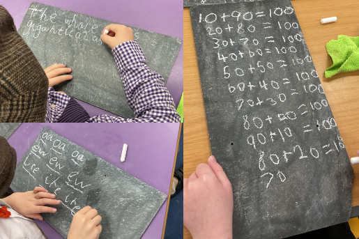 Some samples of Literacy, Maths and Phonics lessons on slate with chalk.