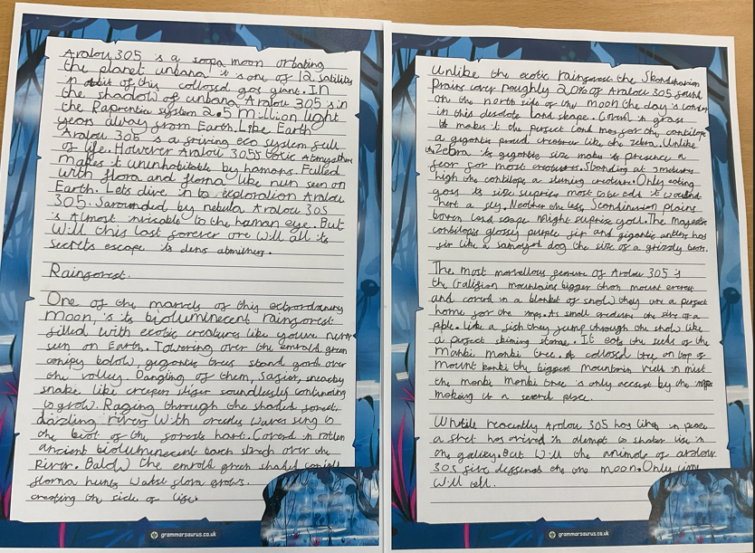 Over the past few weeks, the children have been hard at work crafting their own setting stories inspired by Pandora. We've been exploring how to build atmosphere, use descriptive vocabulary, and bring imaginary worlds to life. The pupils have shown incredible creativity, and we are delighted to share some examples of the excellent writing they have produced. Their attention to detail and imagination have really shone through!